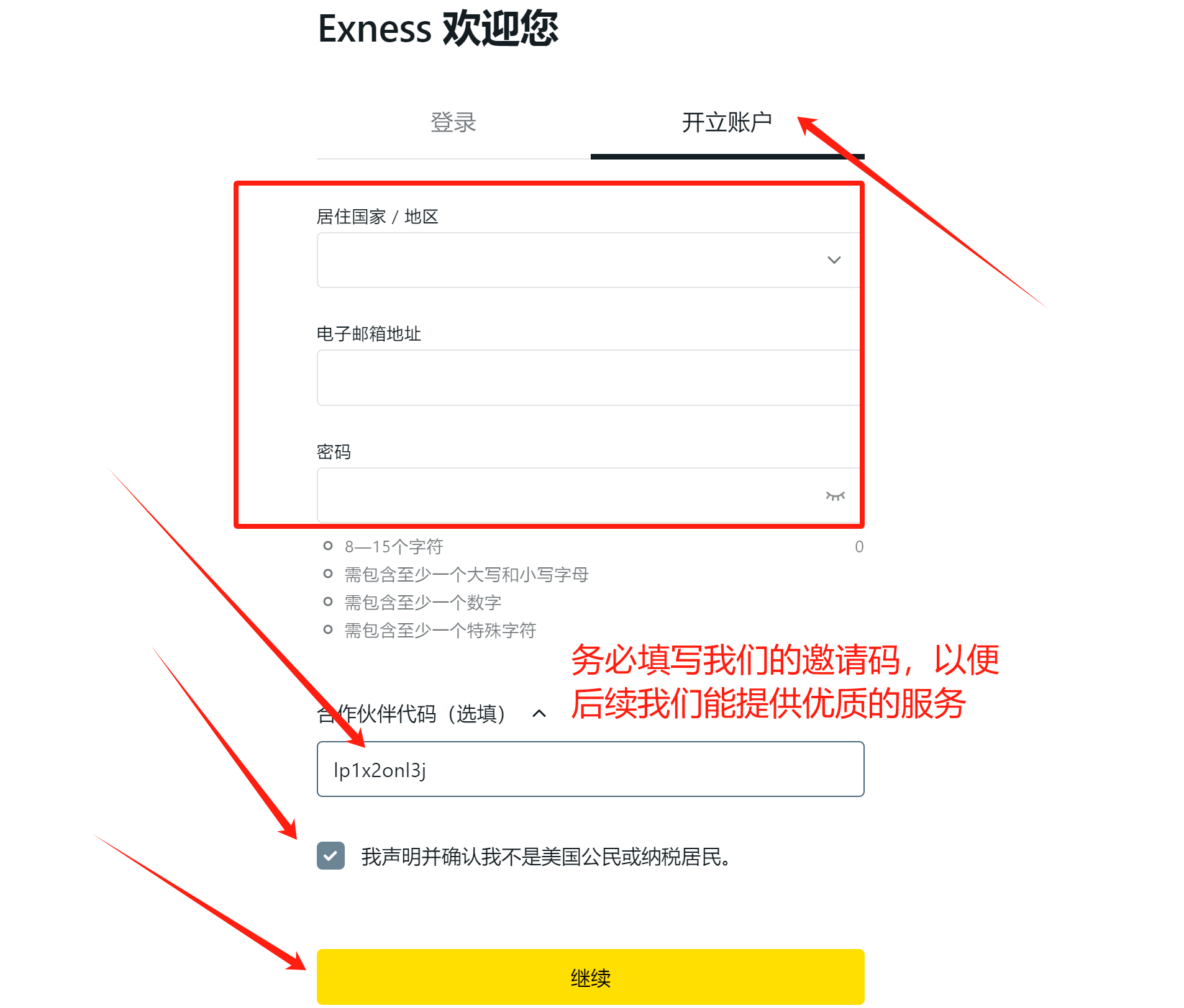 选择开立账户,地区选择中国,填写电子邮箱和密码(请妥善备份)。